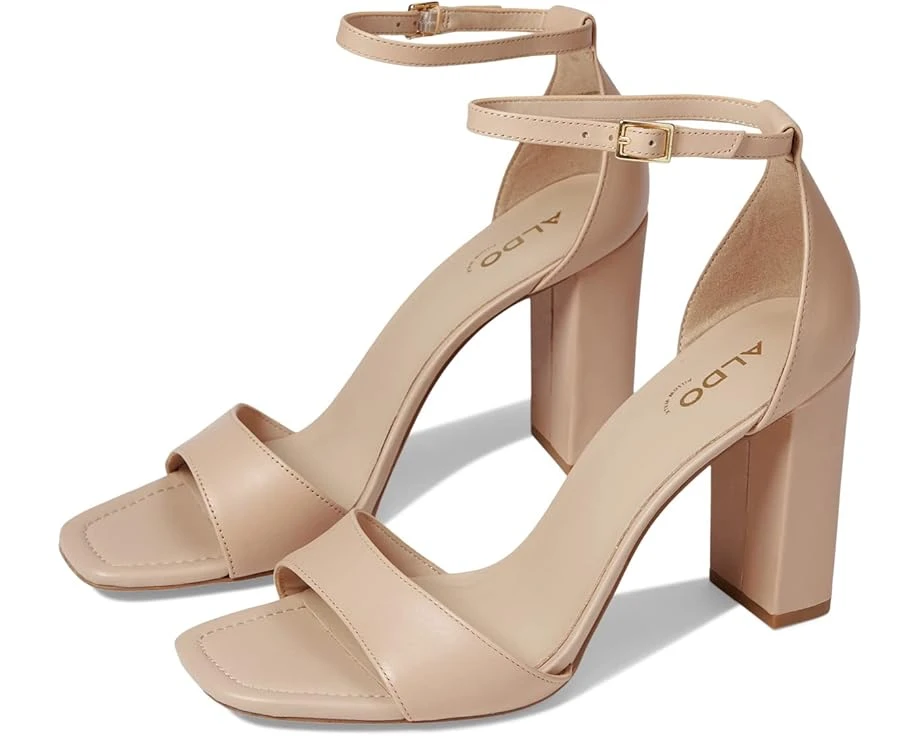 The primary materials that compose this product contain a minimum of 20 percent recycled content.SKU: #9876230Take every step stylishly and walk with grace wearing ALDO® Enaegyn Heels.Cow leather and zinc alloy upper.Waterborne polyurethane and recycled polyester lining and insole.Ankle strap and buckle closure.Block heel.Brand logo on insole.Open wide squared toe.Rubber outsole.Imported.Measurements:
