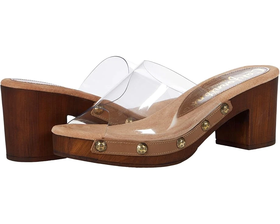 SKU: #9550679The weekend is calling in the Californians Claire slip-on heel.Slip on sandal with platform and faux wood chunky heel.Wide clear strap with peep toe. Contoured footbed with light padding for added all day comfort. Brass hardware studs on platform. Vinyl upper.Suede-wrapped 6mm foam insole.Polyurethane midsole.Textured polyurethane outsole.Made in USA with domestic and imported materials.