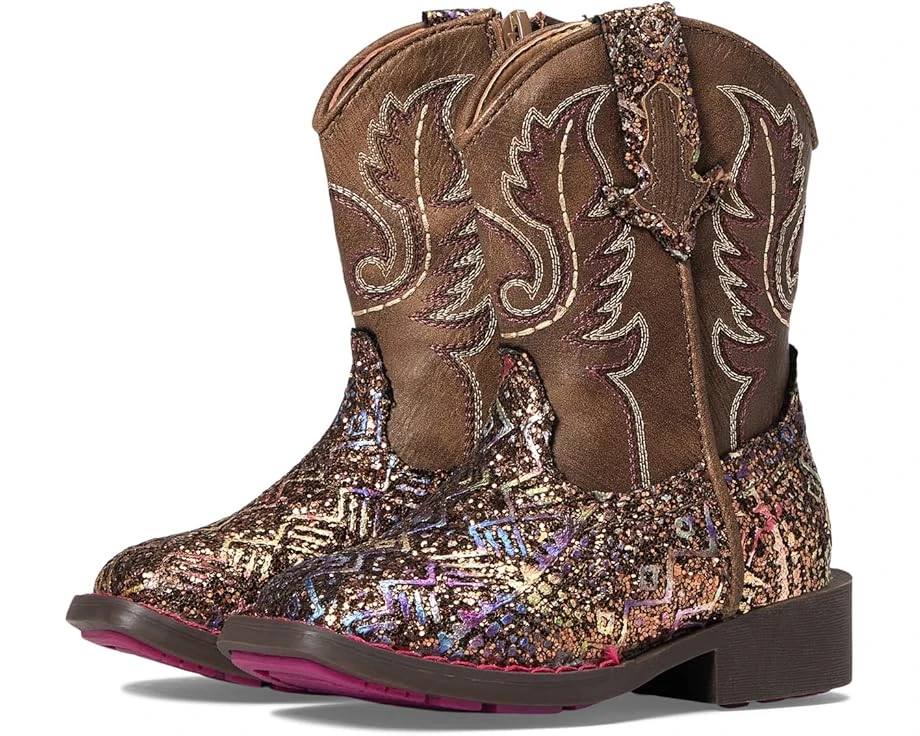 Look top-notch stylish without losing comfort by wearing the Roper® Kids Glitter Aztec Boots.SKU: #9855500Man-made upper.Man-made lining and insole.Side zippered closure.Square toe silhouette.Glitter work on the upper.Man-made outsole.Imported.Product measurements were taken using size 5 Toddler, width M. Please note that measurements may vary by size.Measurements: