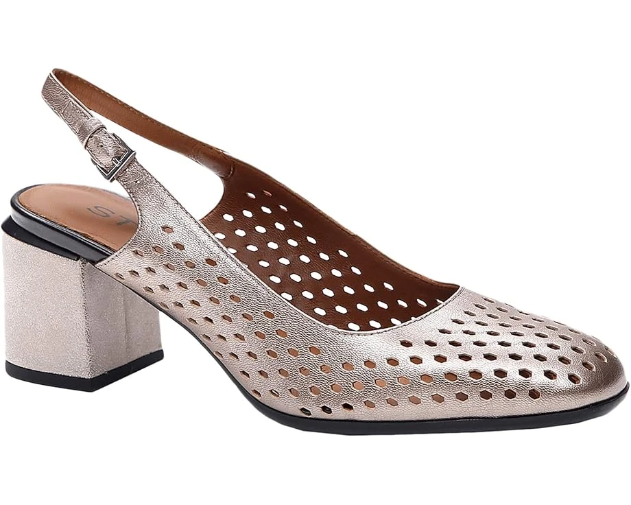 Your style is all the rage wearing the Stonefly Bridget 7 Laminated Lth heels. SKU: #9531890Perforated metallic Italian leather upper. Slip-on construction with slingback ankle strap. Buckle closure. Square-toe silhouette. Leather lining and insole. Blu Soft technology is a unique gel pad created to relieve shock absorption.Block heel. Synthetic rubber outsole. Imported.